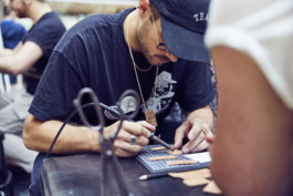 Patches aus unterschiedlichen Lederqualitäten werden mit dem Lötkolben verziert. Hier entstehen personifizierte Schlüsselanhänger, Armbänder, Ketten, Ringe oder Embleme, die mit Handstichen an den mitgebrachten Kleidungsstücken befestigt werden.