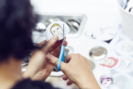 Eigene Zeichnungen, Fashion-Statements oder Stoffreste können vor Ort als Buttons angefertigt und kombiniert werden.